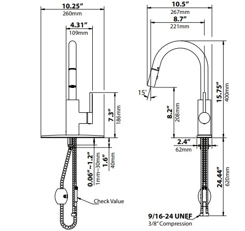 - загальна висота 400 мм, поворотний вилив на 360º: висота 208 мм, довжина 221 мм, висувний шланг 510 мм