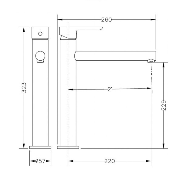 - - вилив: висота 229 мм, довжина 220 мм, загальна висота 323 мм