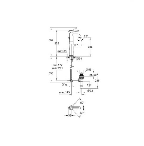- - вилив: довжина 107 мм, висота 234 мм, загальна висота 325 мм