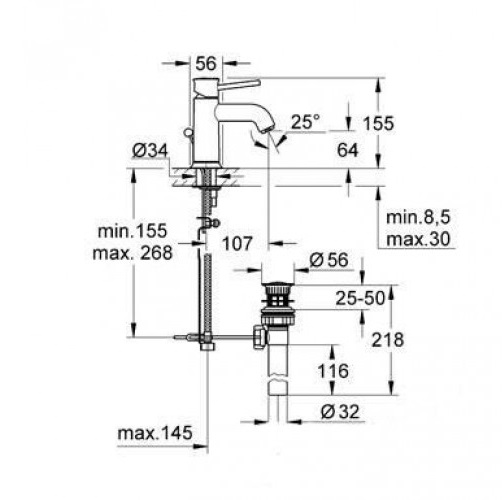 - - вилив: довжина 107 мм, висота 64 мм, загальна висота 155 мм