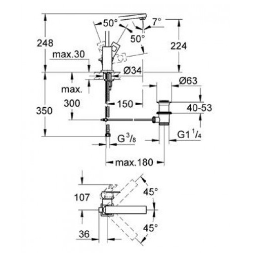 - - поворотний вилив: довжина 150 мм, висота 224 мм, загальна висота 248 мм