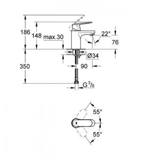 - - вилив: довжина 90 мм, висота 76 мм, загальна висота 148 мм