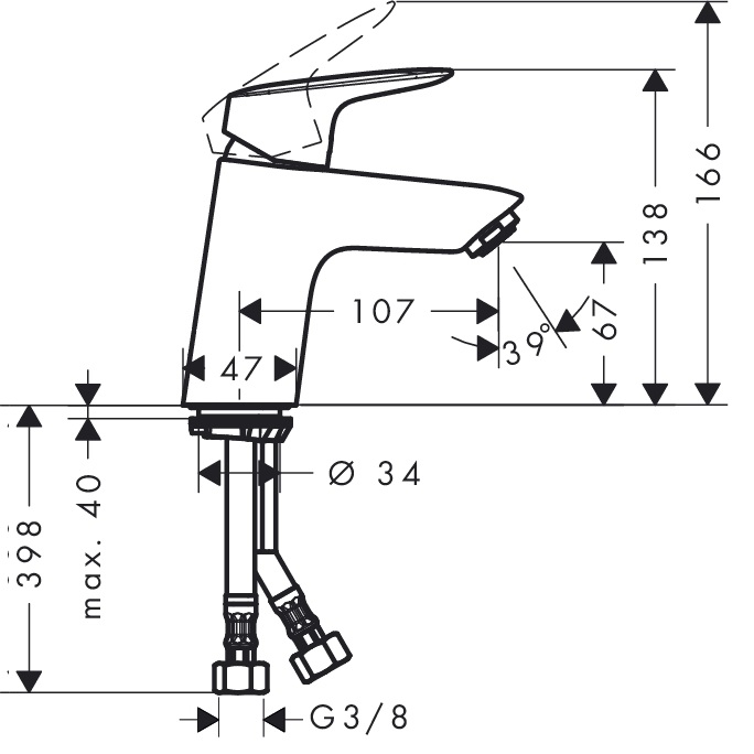 - Загальна висота змішувача 138/166 мм, литий вилив: висота 67 мм, довжина 107 мм