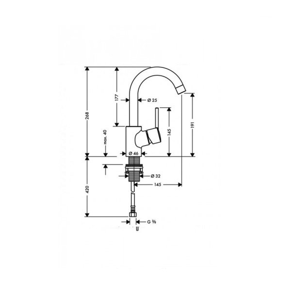 - Загальна висота 268 мм, поворотний вилив на 360°: висота 191 мм, довжина 145 мм