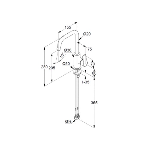 - загальна висота 280 мм, поворотний вилив: висота 205 мм, довжина 155 мм, бічний важіль