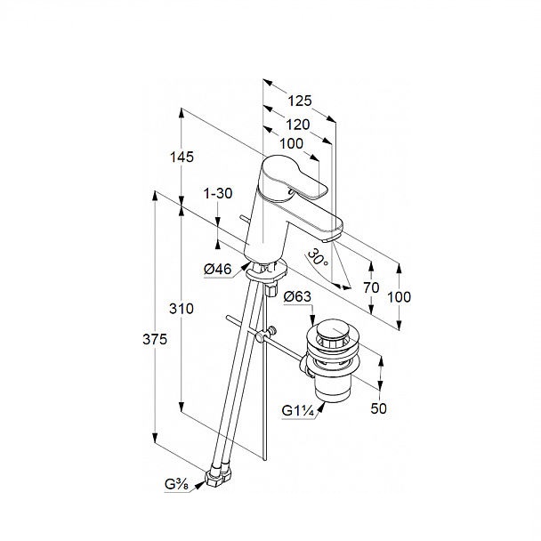 - аератор M 24 x 1, керамічний картридж з обмеженням гарячої води, підводка - гнучкі шланги G 3/8, донний клапан (пластик)