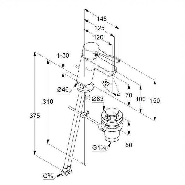 - аератор M 24 x 1, витрата води 7 л/хв., донний клапан, керамічний картридж з обмеженням гарячої води, підводка - гнучкі шланги G 3/8