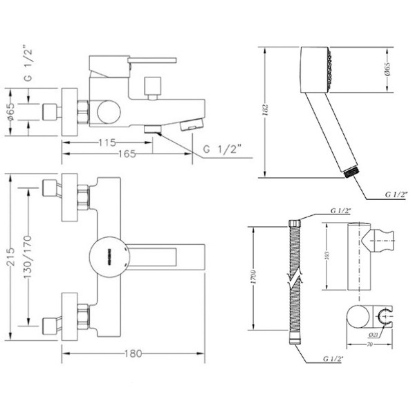 Змішувач для ванни і душу Genebre Tau2 65100294566, з душовим гарнітуром.
