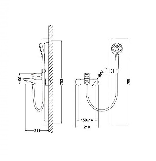 - перемикач ванна/душ, довжина стійки душа 753/788 мм, довжина душового шланга 1500 мм