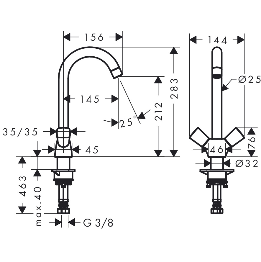 - - загальна висота 283 мм, висота виливу 212 мм, кут повороту виливу регулюється на 3 рівні на 110°, 150° або 360°