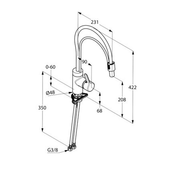 - загальна висота 422 мм, поворотний вилив 360°: висота 208 мм, довжина 231 мм, з гнучким висувним виливом