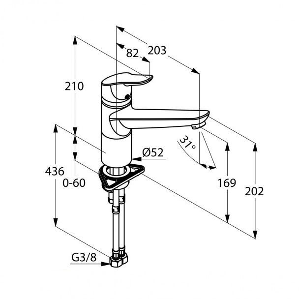 - висота змішувача 210 мм, поворотний вилив 360°: довжина 203 мм, висота 169 мм