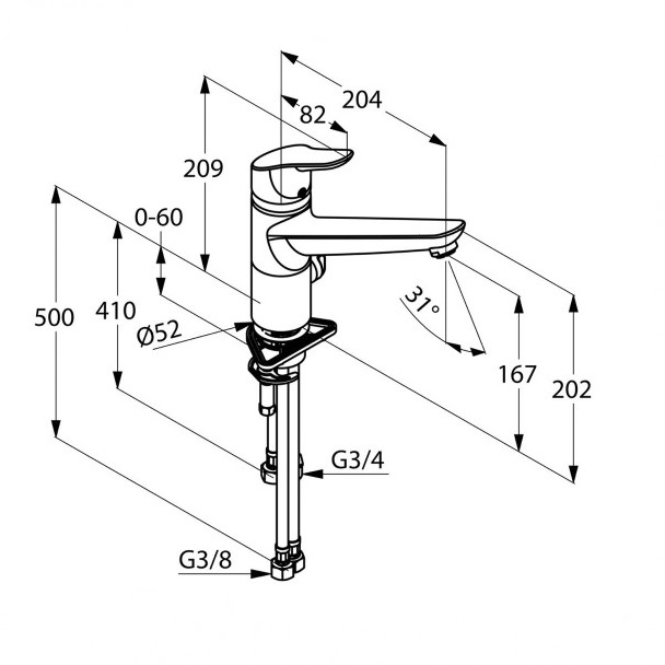 - висота змішувача 209 мм, поворотний вилив 360°: довжина 204 мм, висота 167 мм