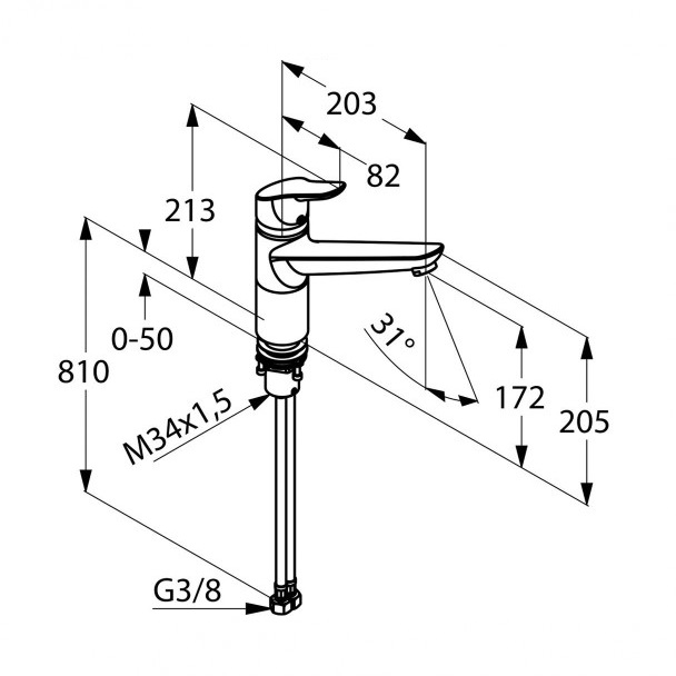 - висота змішувача 213 мм, поворотний вилив 360°: довжина 203 мм, висота 172 мм