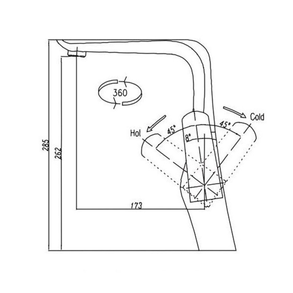 - -загальна висота змішувача 285 мм, поворотний вилив 360°:висота 262 мм, довжина 173 мм