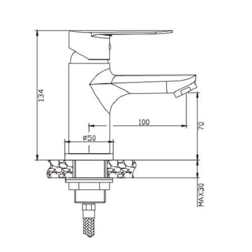 - висота змішувача 134 мм, висота виливу 70 мм, довжина виливу 100 мм