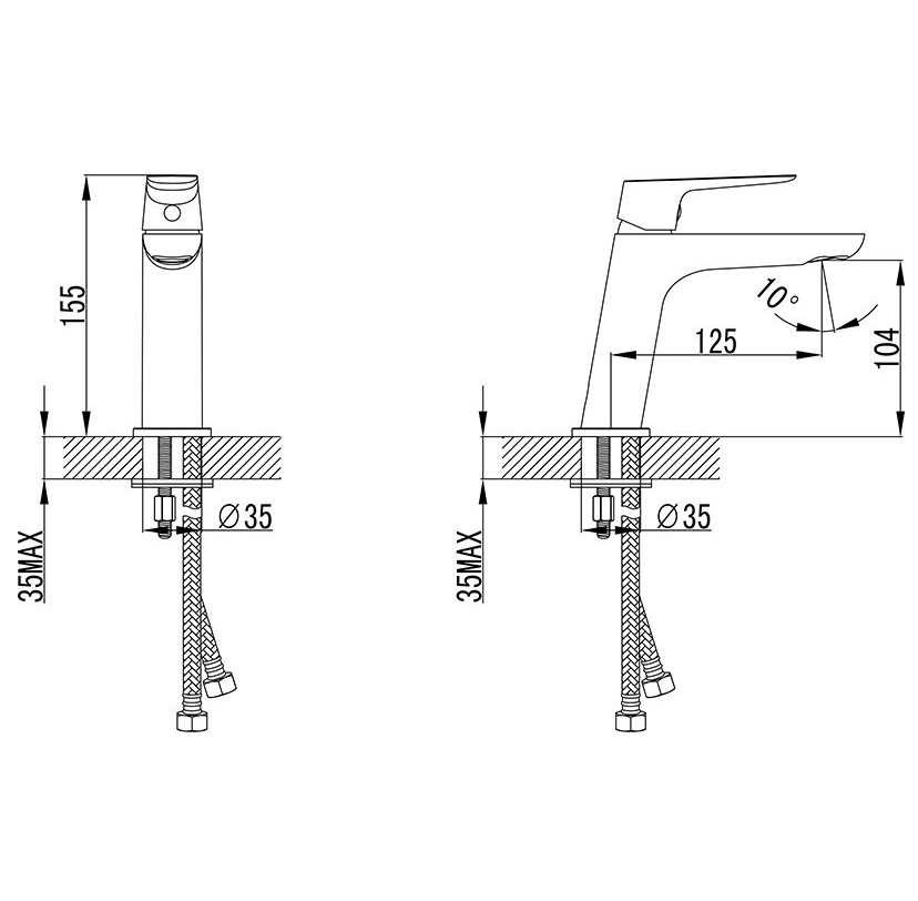 - змішувач: загальна висота 155 мм, вилив: висота 104 мм, довжина 125 мм