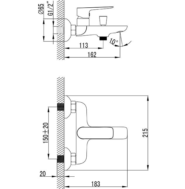 - керамічний картридж Ø 25 мм, загальна ширина 215 мм, винос виливу 183 мм