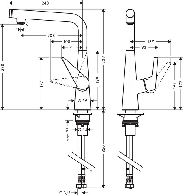 - Загальна висота змішувача 339 мм, поворотний вилив на 3 рівні 110°, 150°, 360°: висота 288 мм, довжина 248 мм