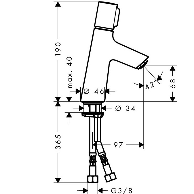 - Загальна висота змішувача 190 мм, литий вилив: висота 68 мм, довжина 97 мм, управління натискне верхнє