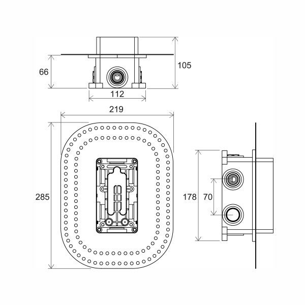 R-box Multi підходить для стандартного чотиристороннього змішувача прихованого монтажу. Якщо встановлено тристоронній змішувач прихованого монтажу, необхідно закрити один вивід R-box Multi. Призначений для багатофункціонального змішувача прихованого монтажу (напр. для CR 067.00) - виведення води в три місця. Встановлення на гіпсокартон або класичну цегляну стіну.