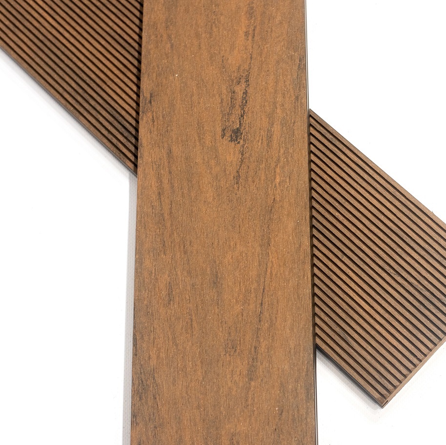 Bauwood (Австрія) - повнотіла терасна дошка з ДПК з малюнком дерева на всю товщину матеріалу. Декінг має два боки: один виконано під спил дерева, а інший рифлений. Лицьовою, може бути будь-яка сторона - вибір залишається за замовником. Крім того, на такому покритті неможливо посковзнутися навіть під час ходьби босоніж. Володіє фактурою деревини, що не стирається. Ідеально підходить для радіусної підрізки будь-якої складності. За зовнішнім виглядом і тактильними відчуттями максимально відповідає натуральному дереву. Поверхня в зборі шовна.