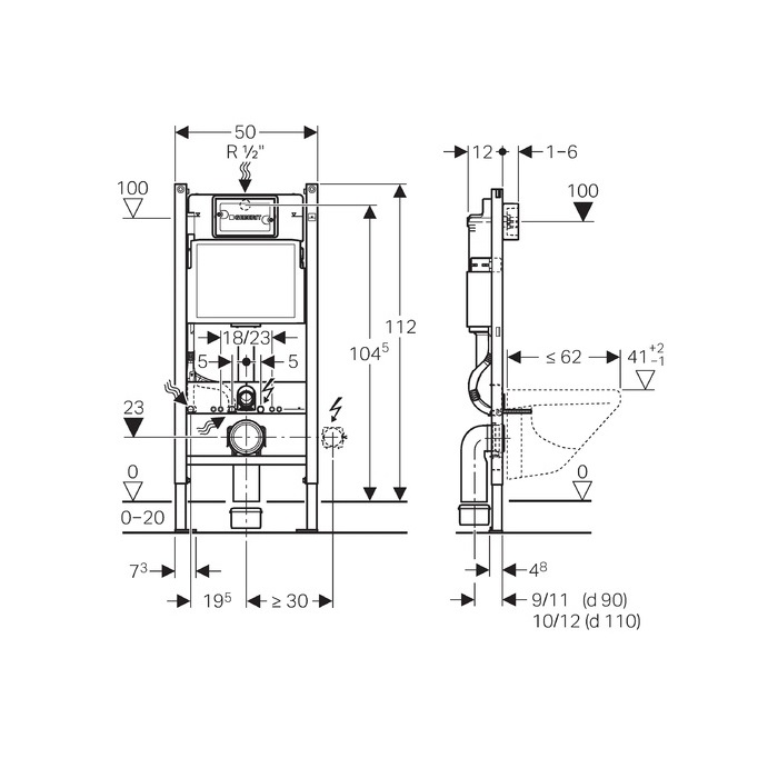 - Інсталяція Geberit Duofix 458.126: бачок прихованого монтажу з фронтальним керуванням змиву UP100, товщина 12 см, повністю герметизований від потрапляння конденсату, підведення води по центру/ззаду/зверху. Подвійний змив при використанні зі змивною клавішею Delta 21/50/51, одинарний змив при використанні зі змивною клавішею Delta 11/15/40. Рама порошкового забарвлення, самонесуча конструкція, з отворами 9 мм для кріплення в дерев'яному каркасі, ніжки оцинковані з безступінчатим регулюванням 0-20 см. Опорний майданчик із пластику, глибина підходить для монтажу в профіль UW50.