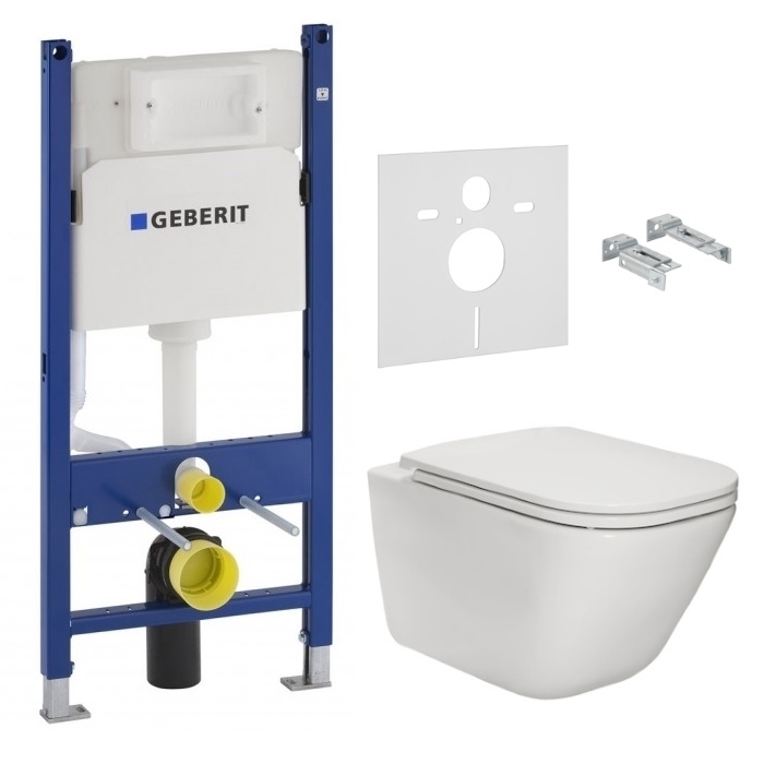 - Інсталяція Geberit Duofix 458.126: бачок прихованого монтажу з фронтальним керуванням змиву UP100, товщина 12 см, повністю герметизований від потрапляння конденсату, підведення води по центру/ззаду/зверху. Подвійний змив при використанні зі змивною клавішею Delta 21/50/51, одинарний змив при використанні зі змивною клавішею Delta 11/15/40. Рама порошкового забарвлення, самонесуча конструкція, з отворами 9 мм для кріплення в дерев'яному каркасі, ніжки оцинковані з безступінчатим регулюванням 0-20 см. Опорний майданчик із пластику, глибина підходить для монтажу в профіль UW50.