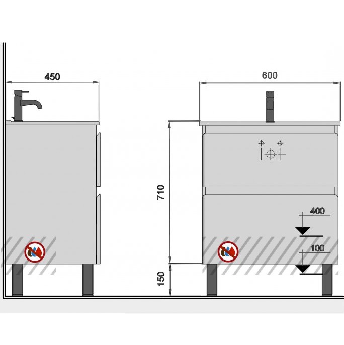 - розмір тумби з умивальником: ширина 600 мм, висота 860 мм, глибина 450 мм, можливе встановлення без ніжок (підвісна)