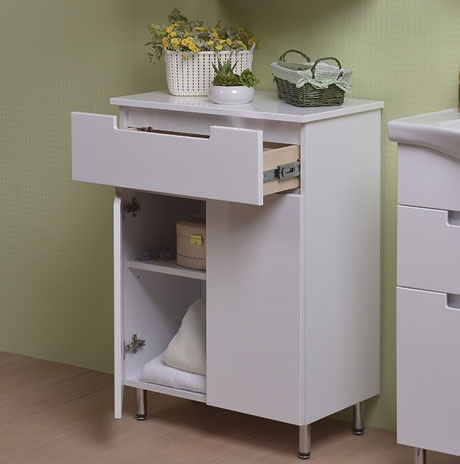 - верхня висувна шухляда з доводчиками, 2 орні дверцята, усередині 1 полиця з ДСП, для навішування дверей використовуються петлі з доводчиками Hefele (Німеччина), 4 хромовані ніжки в комплекті (висота 100 мм, регулюються по висоті), елементи декору на фасаді замість ручок