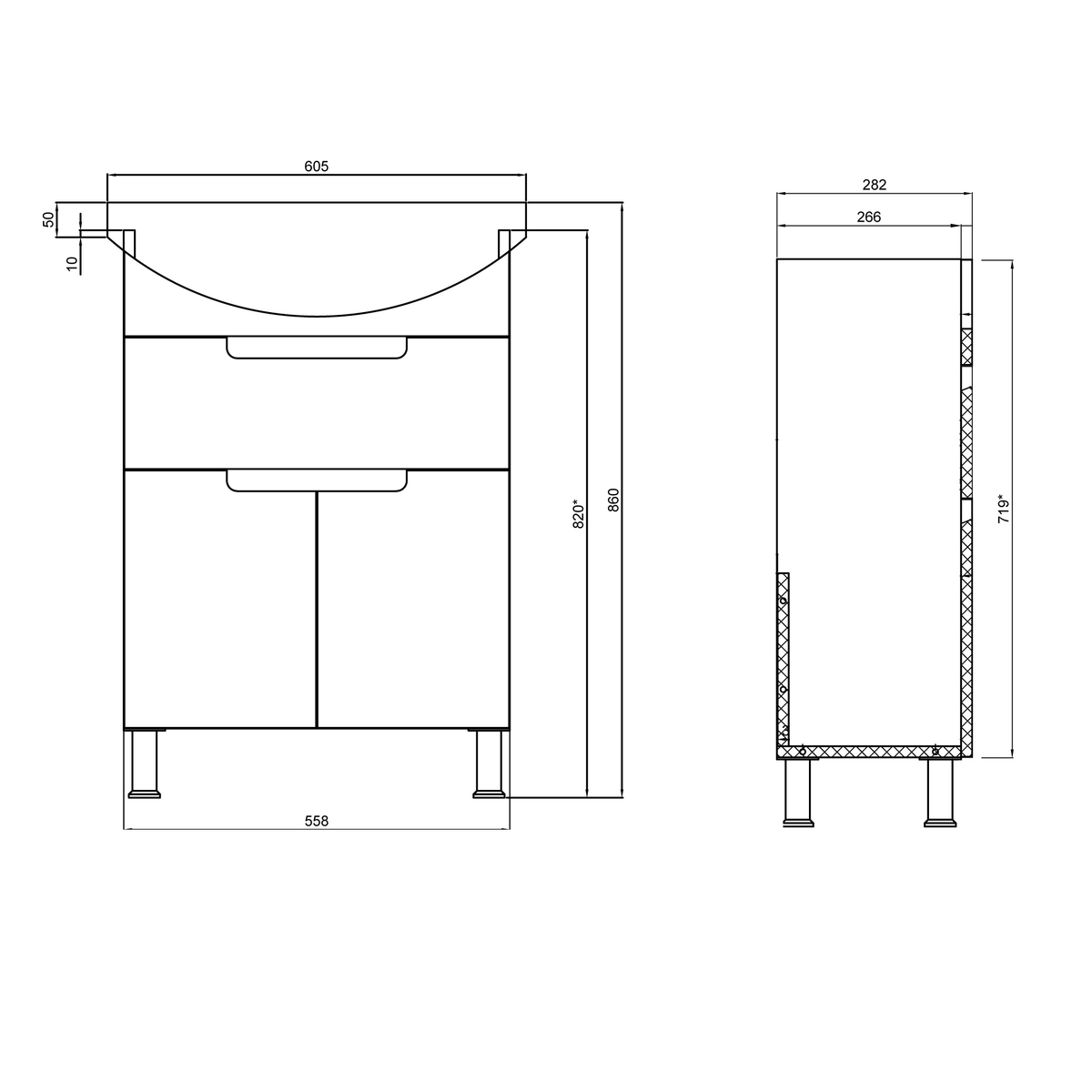 - розмір тумби: ширина 558 мм, висота 720 мм (без ніжок), глибина 282 мм