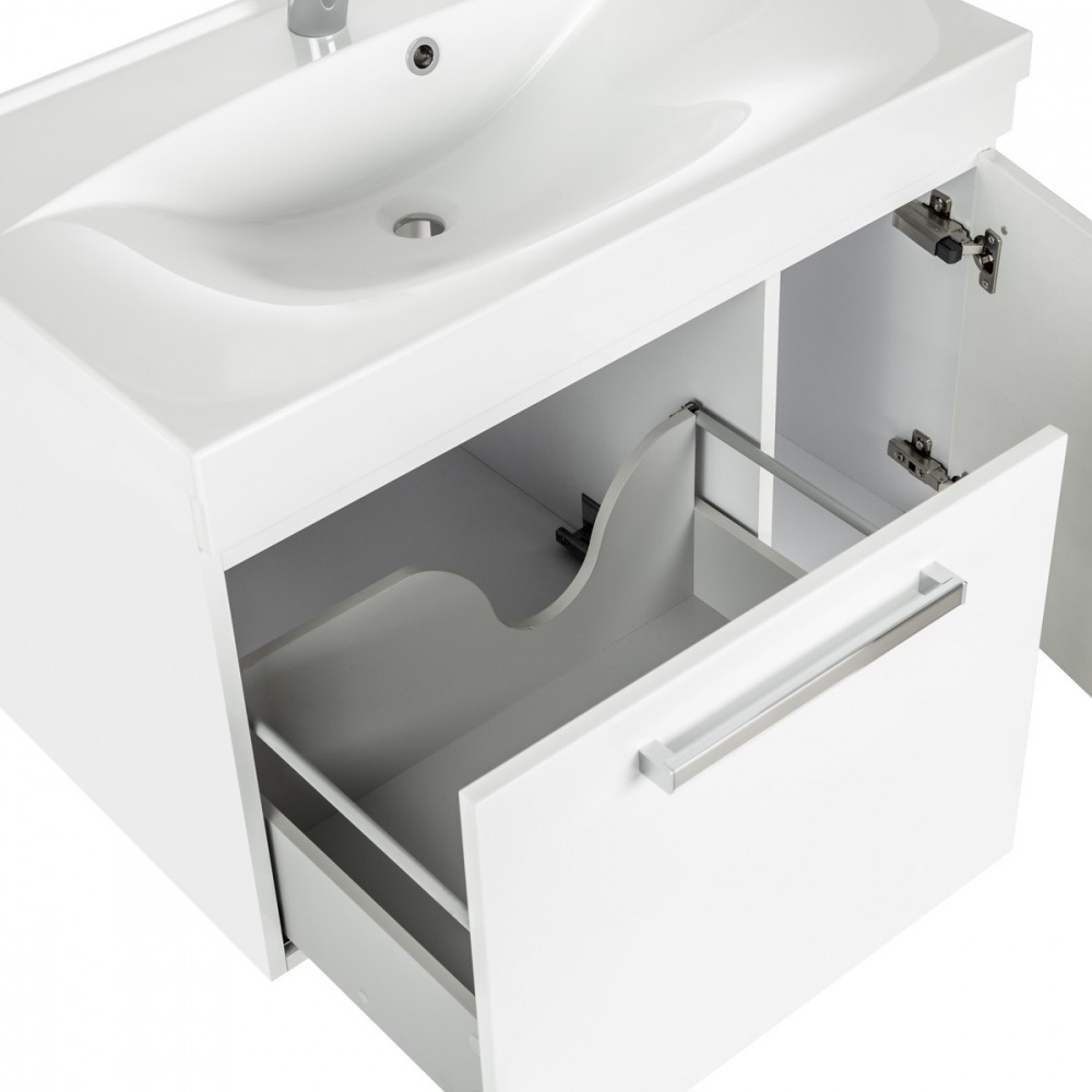 - фасад - вологостійкий пофарбований МДФ 19 мм (покриття емаль), корпус - вологостійкий ДСП 16 мм, фурнітура Blum Австрія, 1 висувна шухляда з доводчиками, 1 дверцята, що відкриваються (петлі праворуч), 2 накладні хромовані ручки в комплекті