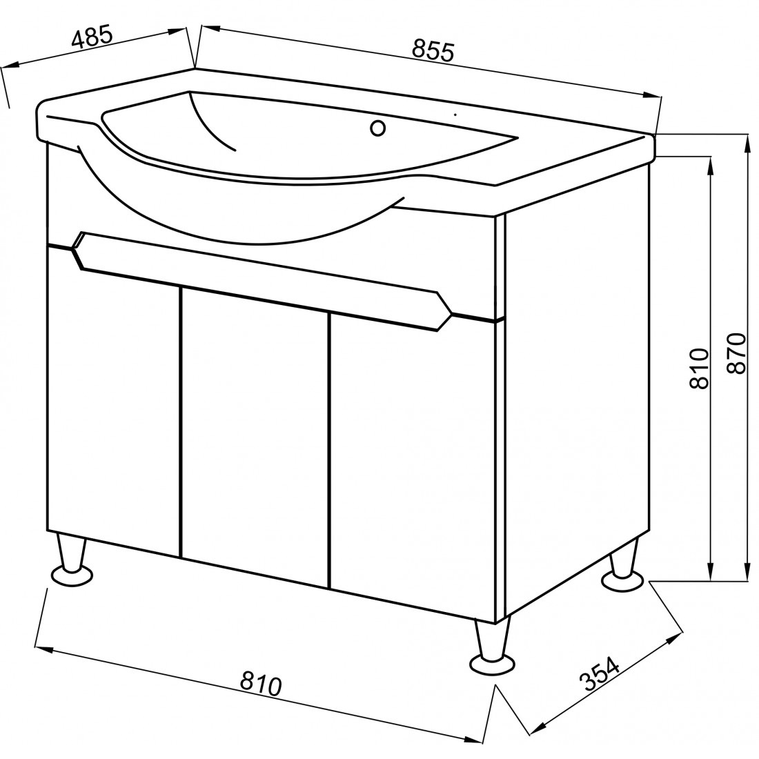 - розмір тумби з умивальником: ширина 855 мм, висота 870 мм, глибина 485 мм