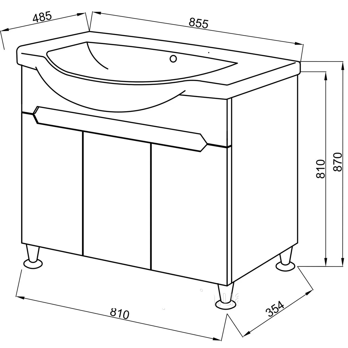 - розмір тумби з умивальником: ширина 850 мм, висота 870 мм, глибина 485 мм
