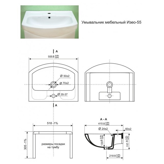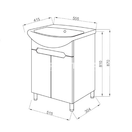 - розмір тумби з умивальником: ширина 555 мм, висота 870 мм, глибина 415 мм