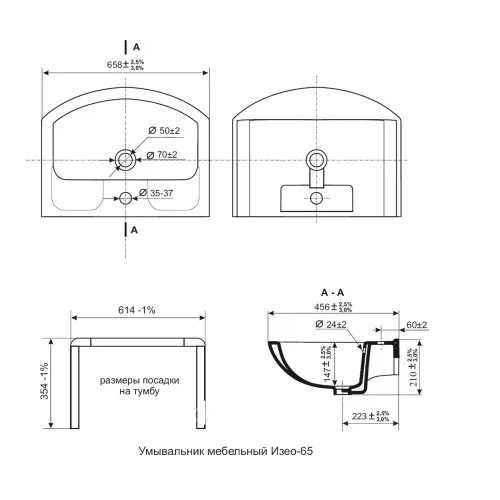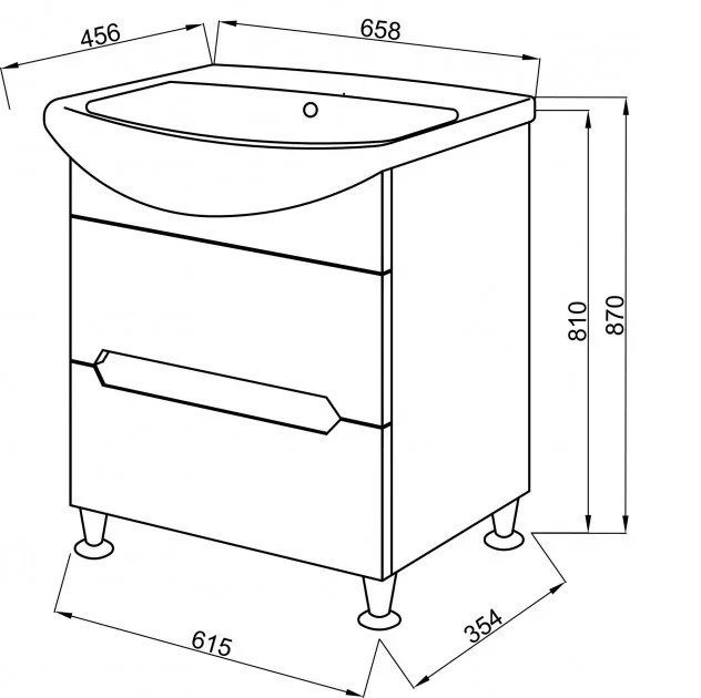 - розмір тумби з умивальником: ширина 658 мм, висота 870 мм, глибина 456 мм