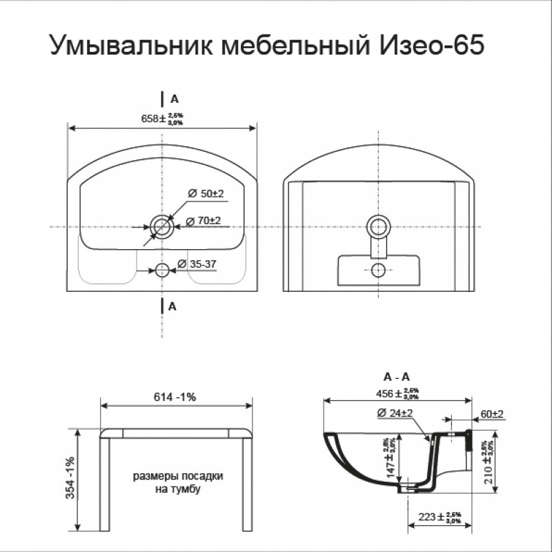 - розмір тумби з умивальником: ширина 658 мм, висота 870 мм, глибина 456 мм