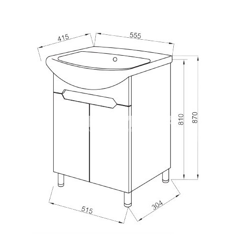 - розмір тумби з умивальником: ширина 555 мм, висота 870 мм, глибина 415 мм