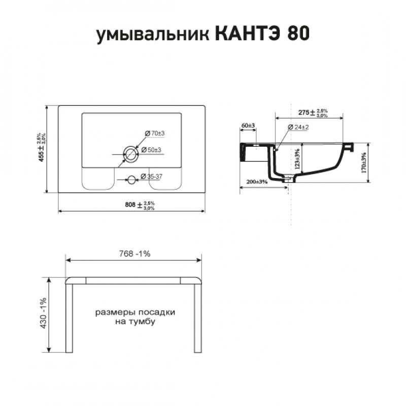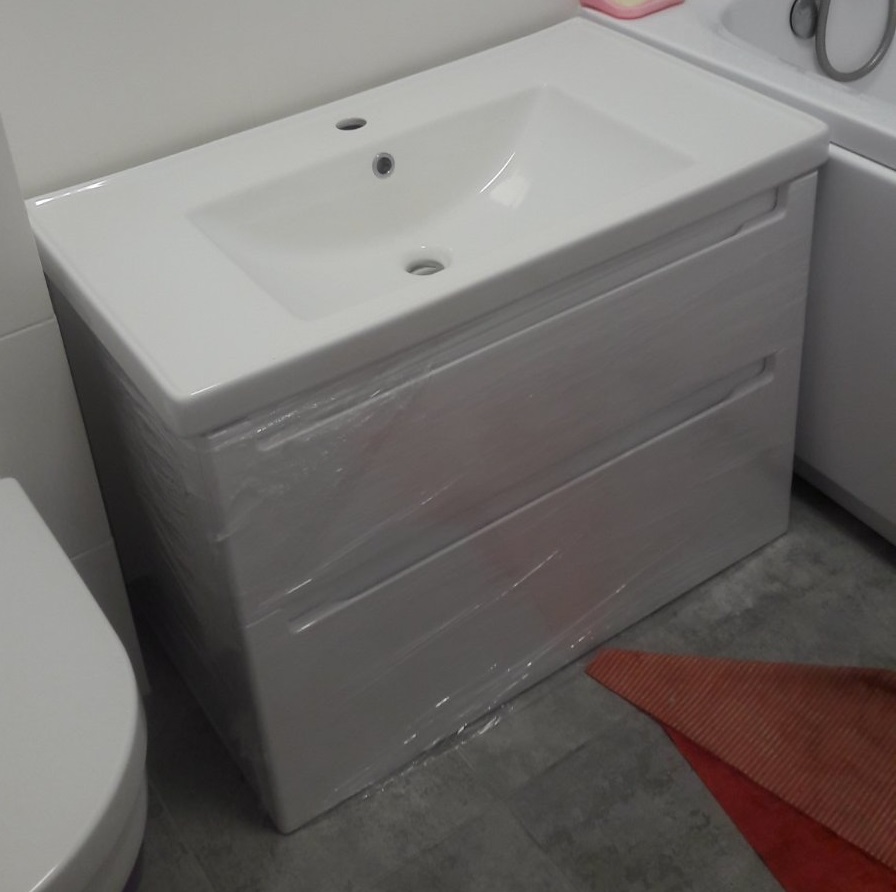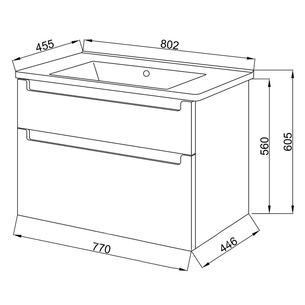 - розмір тумби з умивальником: ширина 802 мм, висота 605 мм, глибина 455 мм