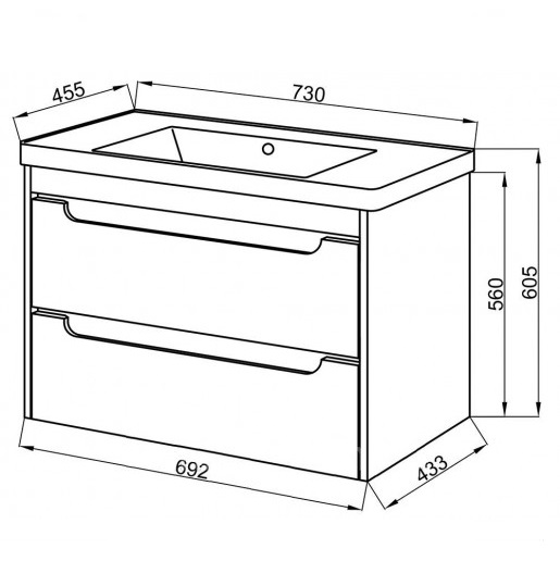 - розмір тумби з умивальником: ширина 730 мм, висота 605 мм, глибина 455 мм