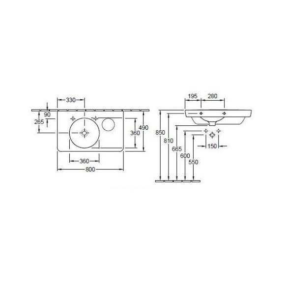 - - для 1-позиційного змішувача, отвір для змішувача вибито праворуч, ліворуч отвір для змішувача підготовлено до вибивання, з переливом